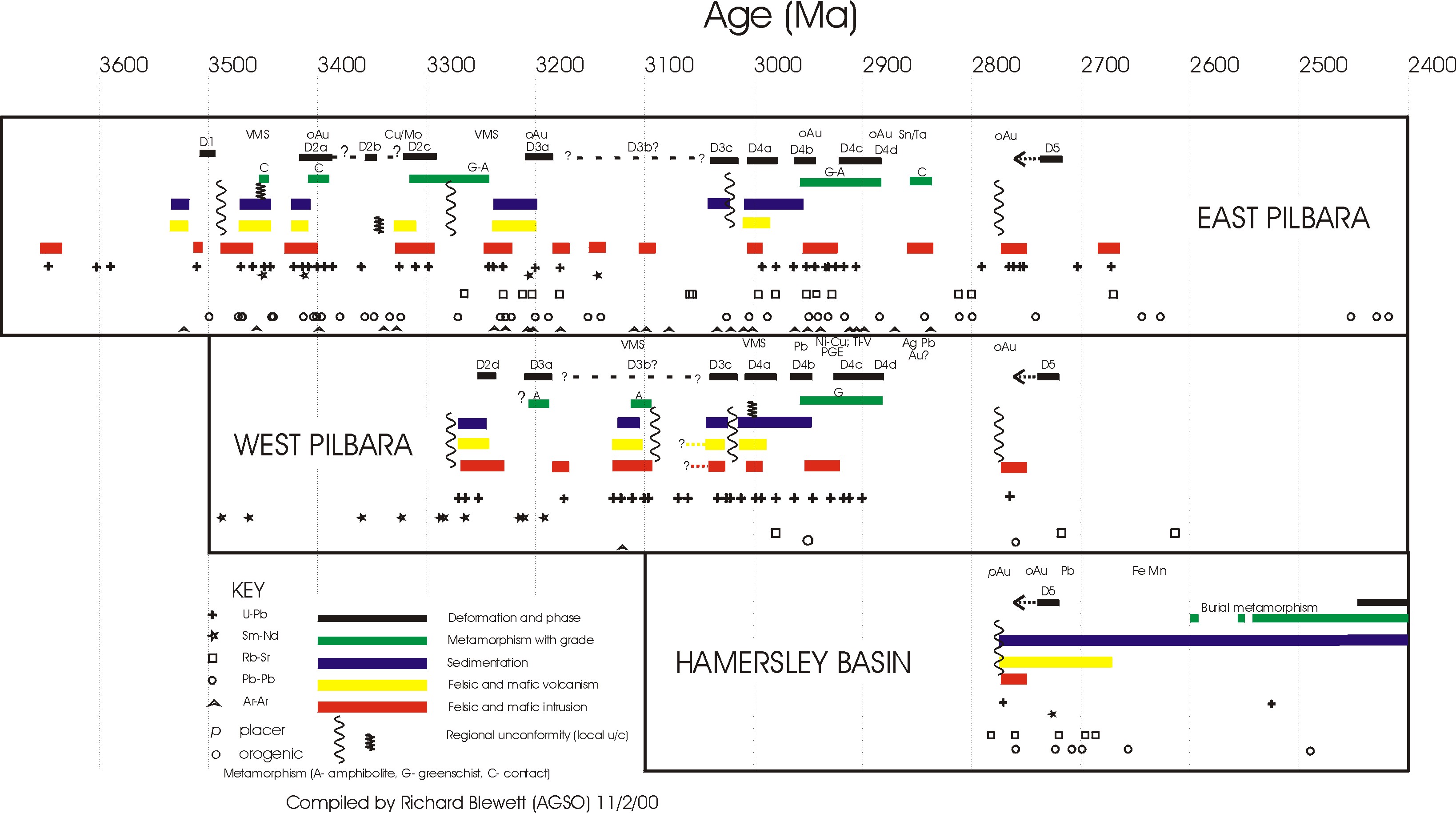The Pilbara was then subjected to a prolonged, almost continuous, period of repeated magmatism between 3015-2920 Ma, with important pulses at 2950 Ma and 2935 Ma (Nelson et al, 1999). The latest so-called 'post-tectonic' Sn-Ta bearing granitoids intruded at ca. 2850 Ma in the east Pilbara and represent the final stages of cratonisation (Bickle et al, 1989).