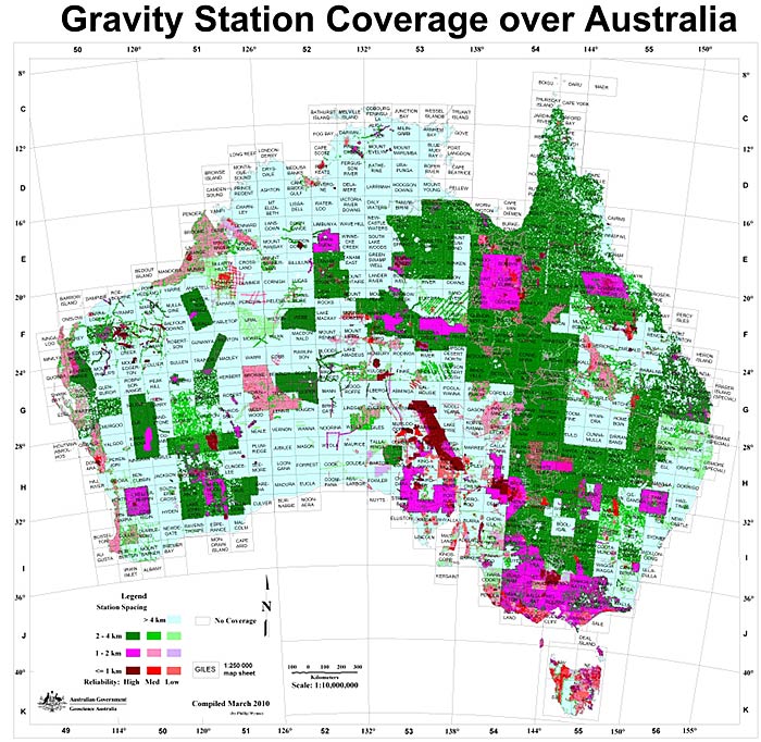 The density and distribution of gravity stations in Australia is shown on the Gravity Station Coverage Map - 1:250 000 Index Map and the Gravity Station Location Map - 1:10 Million Index Map. The gravity station locations shown on these maps are from surveys carried out since 1938 by Geoscience Australia and its predecessors, State and Territory geological surveys, private companies and universities. The regional gravity station spacing varies from approximately 11 kilometres over much of northern and western Australia to 1.5 kilometres in Victoria. The database also contains more detailed surveys with station spacing as close as 50 metres. Federal, State and Territory governments have recently funded systematic infill to provide improved coverage over areas of scientific or economic interest.